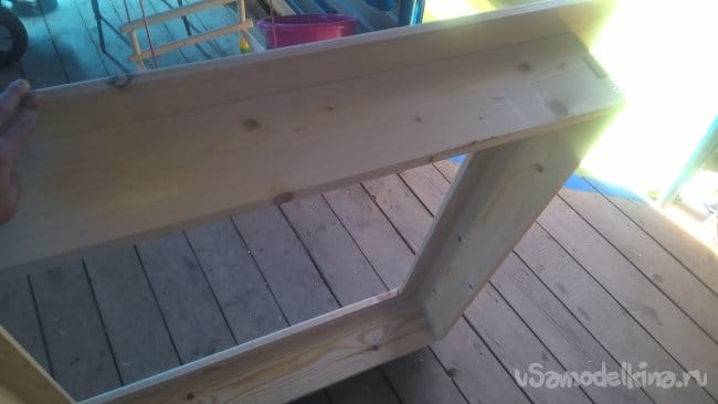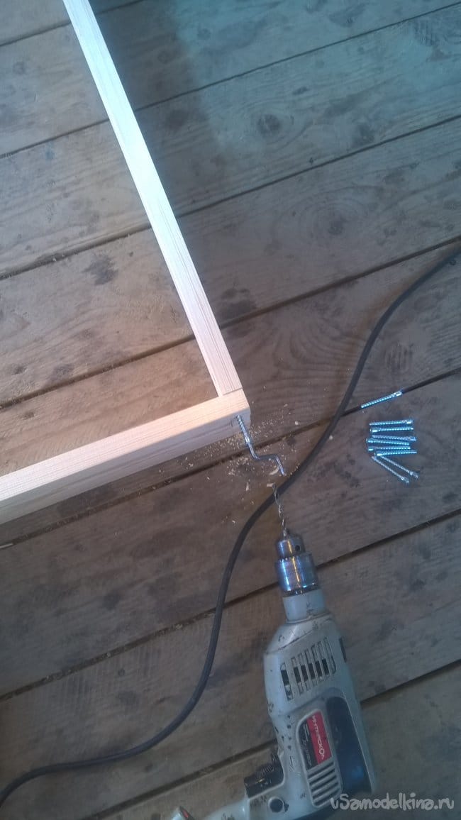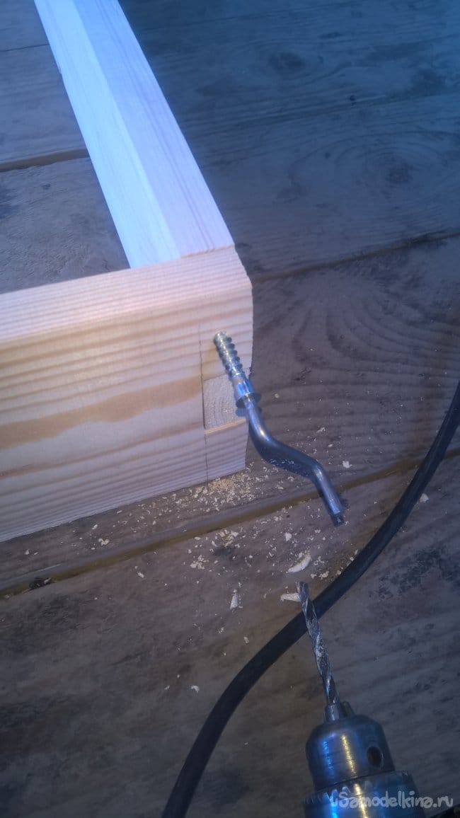 Подогнав размеры всех заготовок, в процессе сборки и убедившись, что все сходится, доски скрепил между собой на мебельные шурупы, заранее просверлив для них отверстия. Под саморезы особенно большого диаметра позволяет избежать раскалывания материала. Иначе работа будет испорчена.