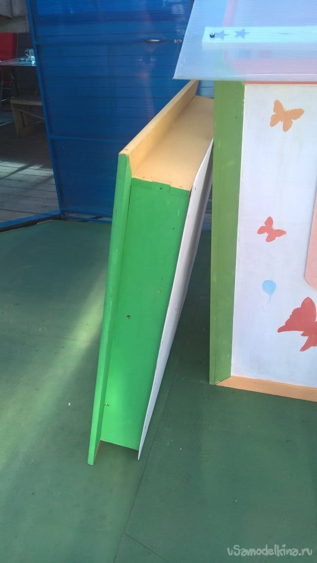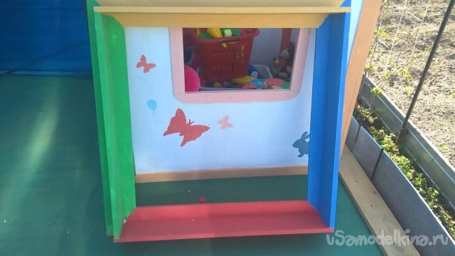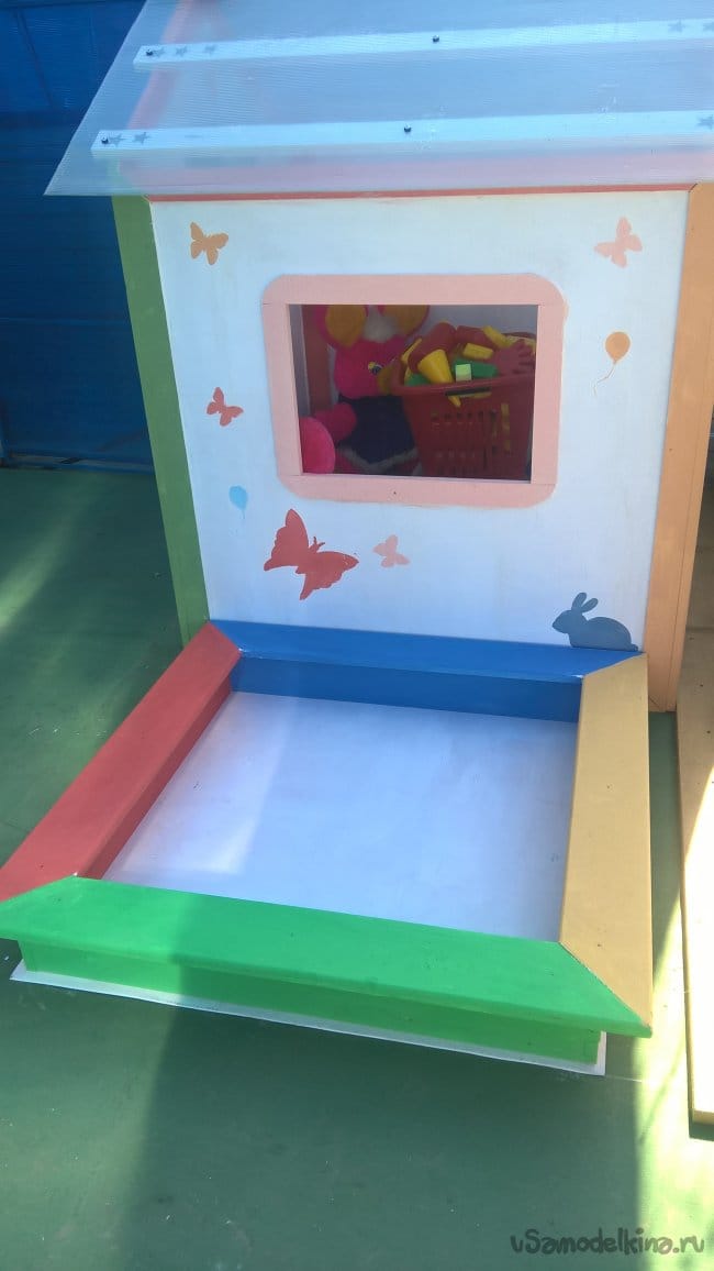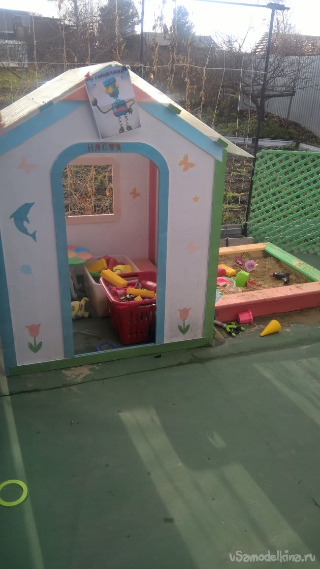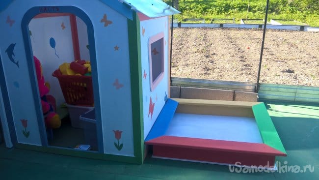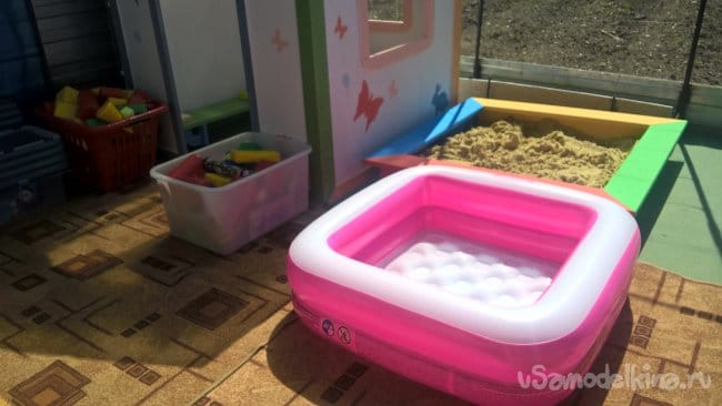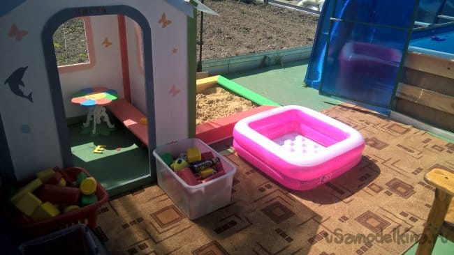 Вот я и закончил строить игровую небольшую простейшую детскую площадку своими руками, где есть домик песочница, а в жаркую погоду можно поставить надувной бассейн. Такие не сложные конструкции сможет собрать любой и не только порадует ребёнка, но и украсит дачный интерьер участка неординарной детской игровой зоной. Так же ко всему этому, если место позволяет можно достроить горку качели. И не нужно останавливаться на стандартных решениях, можно много чего всяких разнообразных идей придумать лишь бы была фантазия и умение красиво сделать.