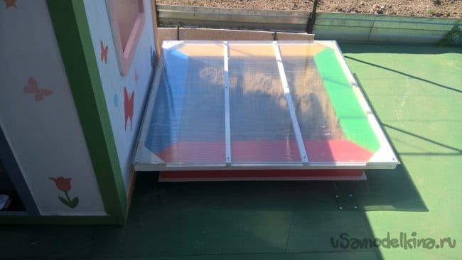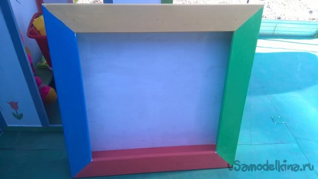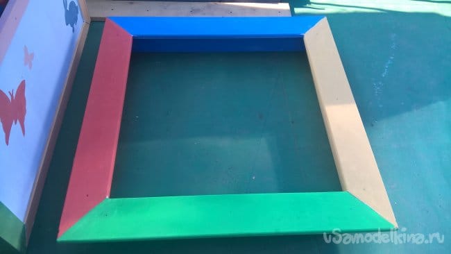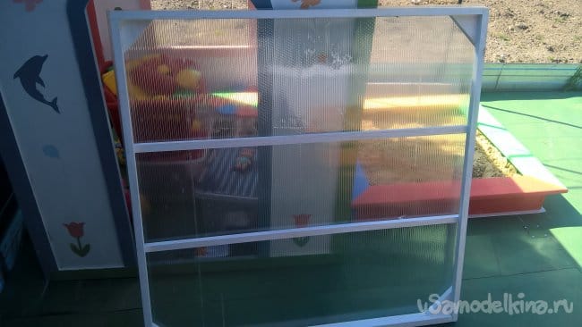 Важным элементом песочницы является крышка. Поэтому следующим этапом изготовил крышку, чтобы защитить от осадков, различного мусора и домашних питомцев, например кошки могут использовать в качестве туалета. В те периоды, когда песочница не используется желательно закрывать. Для этого мне потребовалось из обрезной доски нарезать шесть реек на циркулярной пиле. Из четырёх реек собрал раму, по углам скрепив на приготовленные деревянные уголки и две рейки посредине. Раму тоже обработал и покрыл краской, затем к ней закрепил сотовый поликарбонат.