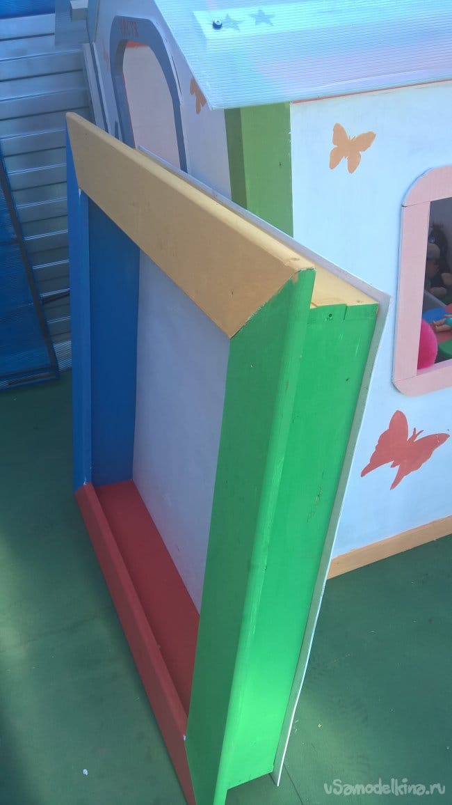 Каркас перед покраской пропитал антисептической пропиткой, защитив от вредителей и потемнения древесины - это продлит срок службы деревянной конструкции. После просыхания покрыл акриловой краской на водной основе, быстро высыхает и экологически безвредна. Не стали ограничиваться одним цветом. С помощью добавления колера в краску в разных ёмкостях развели несколько цветов.