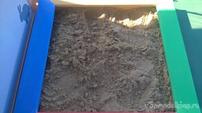 Осталось установить на своё место готовую конструкцию и засыпать песок. Съездили набрали речного песка просушил и просеял чтоб не было камней и не какого мусора. В интернете пишут, речной песок лучше всего подходит для детских игр. Так же песок можно набрать на песчаном карьере или купить в магазине, но думаю в любом случае нужно обязательно просеять