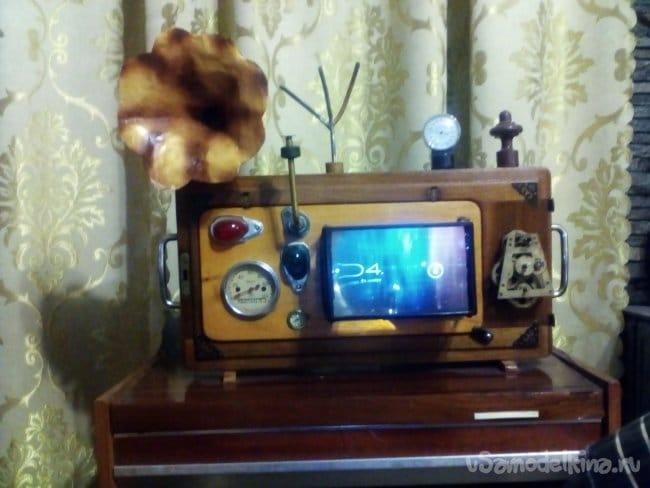 Решил сделать телевизор в стиле «стимпанк»! Купил в интернете ящик от старой швейной машинки, отреставрировал его, по центру прикрепил планшет, перед ним установил на салазках увеличительное стекло, сбоку повырезал отверстия под приборы (нашел старый автомобильный спидометр), так же прикрутил механизм от старых часов, рупор склеил из картона и покрасил краской из баллончика, антенну спаял из медных трубок. Работает как телевизор!