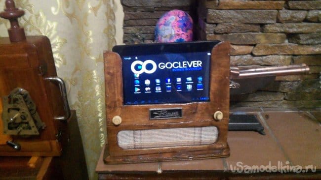 Для другого планшета я сделал рамку из фанеры, внизу вырезал отверстие, якобы для динамиков, внутри приклеил ткань, нашел 2 ручки от старого приёмника и прикрутил. Телевизор готов!