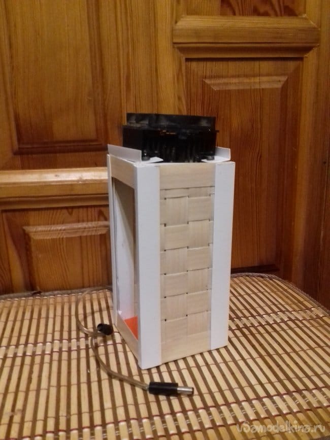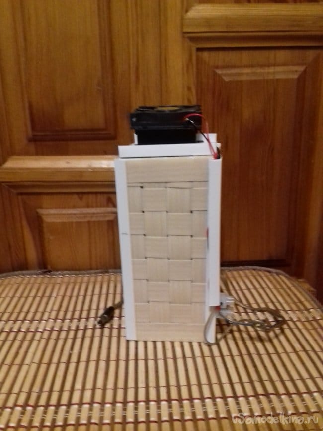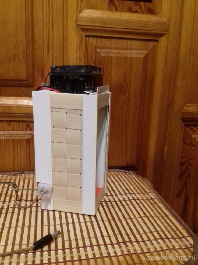 Внутри разместил емкость под сбор жидкости, сверху закрепил радиаторы. Провода отвел в сторону по грани.