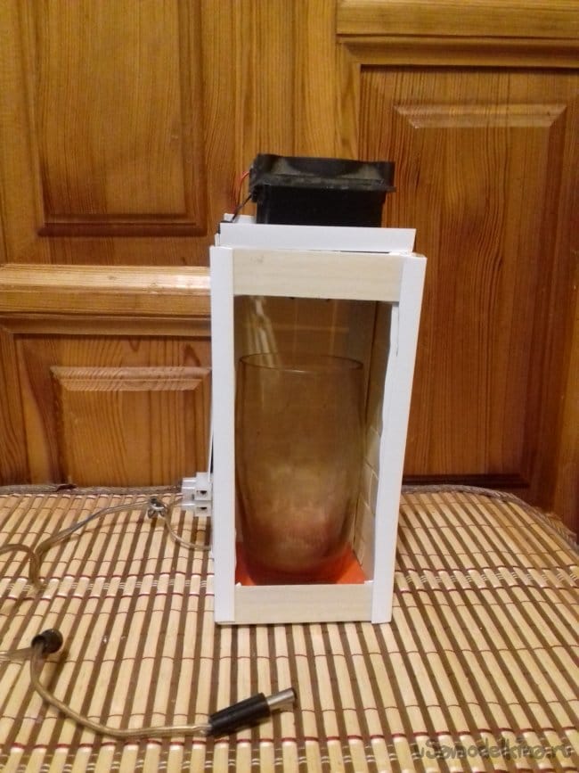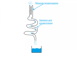 Принцип работы такой. Горячий радиатор частично погружен в короб, поэтому небольшой поток теплого вдуваемого воздуха отражаясь от стенок омывает холодный радиатор. Влажный теплый воздух попав в температуру выпадения росы конденсируется и собирается в емкость.