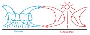 В Антициклоне же наоборот высокое давление, воздух опускается вниз, стает сухим,прохладным