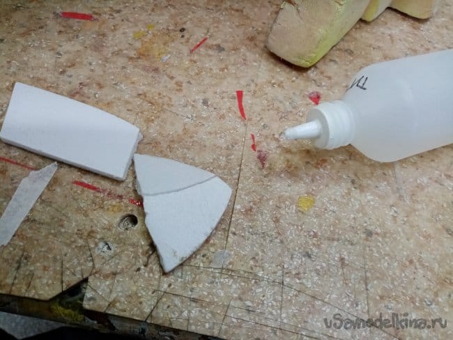 Длинную трещину в носовой части под кабиной ремонтирую следующим образом. Если пенопласт только треснул и не разошелся окончательно, нужно просто отогнуть в сторону деталь. В расширенную трещину наношу клей. В некоторых особо тонких местах разгоняю его отрезком бумаги. Стараюсь не повредить рисунок разъема, затем соединяю края трещины окончательно и фиксирую иголками. При установке иголок стараюсь не попасть в клей. Иначе при извлечении можно вырвать кусок пенопласта вместе с иголкой.