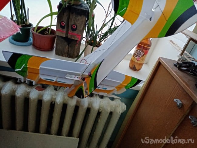 Ремонт закончен, размещаю самолетик на батарее, окончательно просохнуть. Хорошо зимой они горячие. Летом бы пришлось сушить феном для волос.
