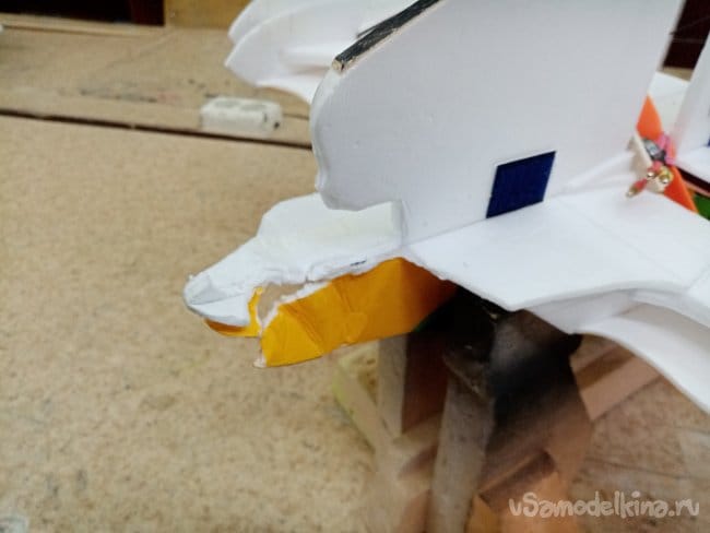 Повреждения носовой части фюзеляжа самые большие. На первый взгляд неустранимые, но пенопласт отличный ремонтопригодный материал, буду восстановливать.