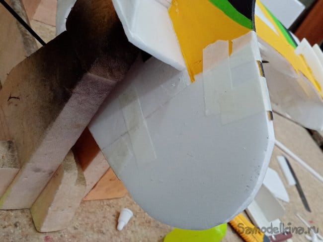 Затем наношу титан и устанавливаю на место тейки усиления крыла. Фиксирую скотчем.