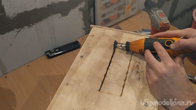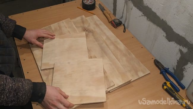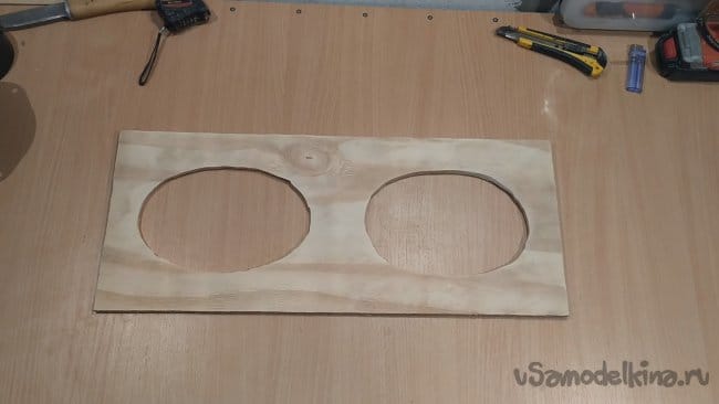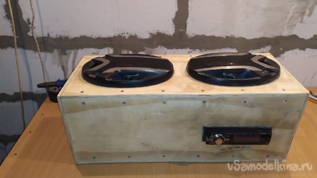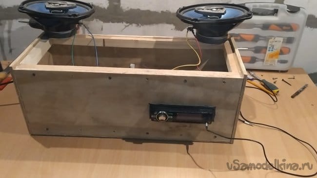 Шаг 4: После того как мы убедились что всё работает, можно приступать к сборке короба для нашей акустики. Размеры короба могут быть произвольными, главное чтобы туда всё поместилось. Затем лобзиком вырезаем отверстия под динамики и под магнитолу.