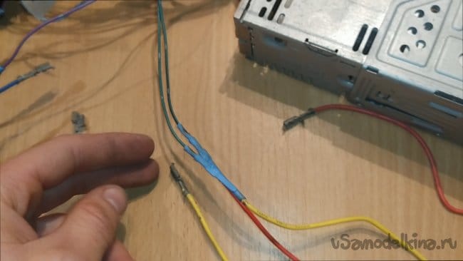 Шаг 2: Далее находим сдвоенные фишки как на фото. Распиновываем жёлтый и чёрный провод и к ним подключаем провода от магнитолы. К жёлтому проводу от блока питания подключаем жёлтый и красный провод от магнитолы. А черный провод от блока, замыкаем с чёрным от магнитолы. И естественно все изолируем.
