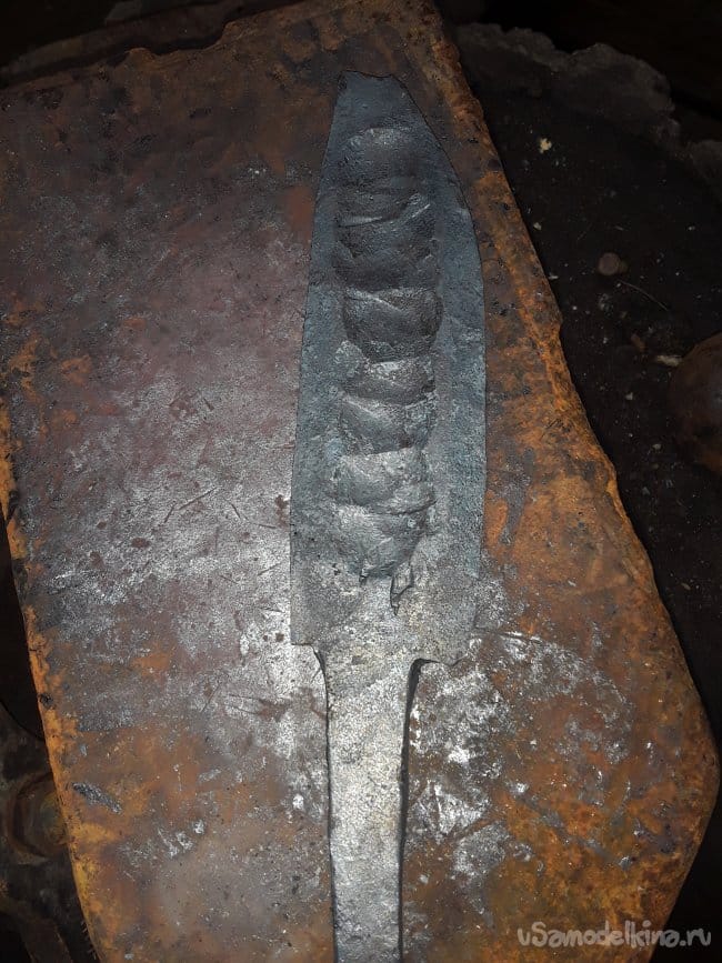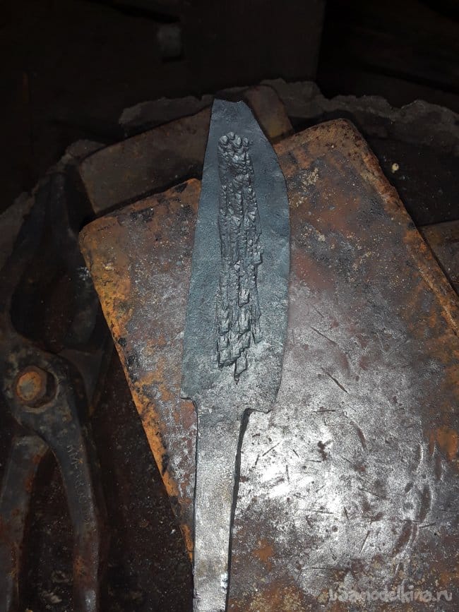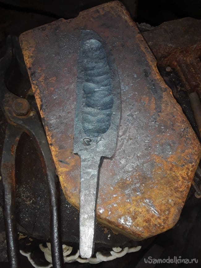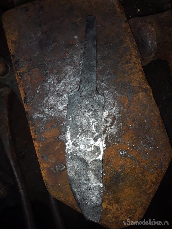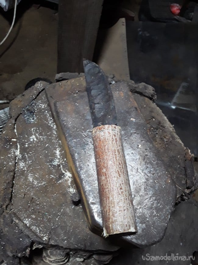 После ковки дола и спуска нагреваю нож до закалочной температуры и даю остыть в подогретом писке. После ковки шлифую клинок в черновую и произвожу отпуск при температуре 180°C в течение 1 часа. И снова шлифую. Вот и все клинок готов теперь пришла очередь рукоятки.