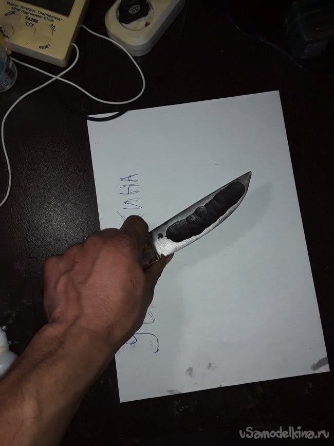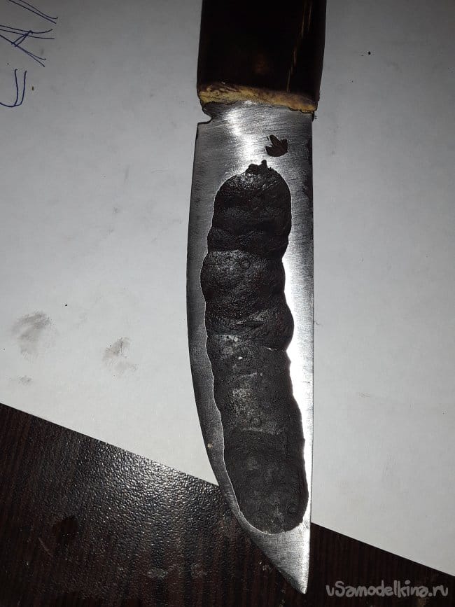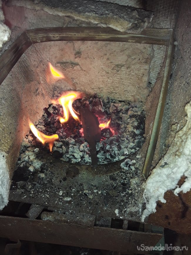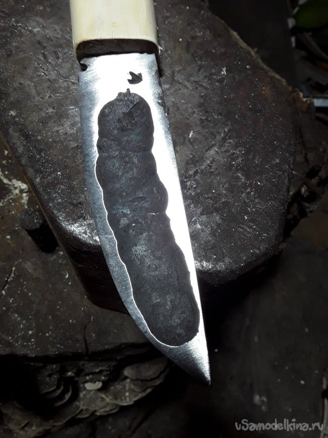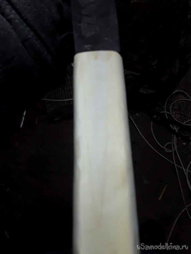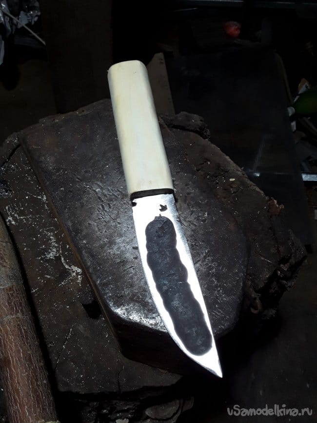После ковки дола и спуска нагреваю нож до закалочной температуры и даю остыть в подогретом писке. После ковки шлифую клинок в черновую и произвожу отпуск при температуре 180°C в течение 1 часа. И снова шлифую. Вот и все клинок готов теперь пришла очередь рукоятки.