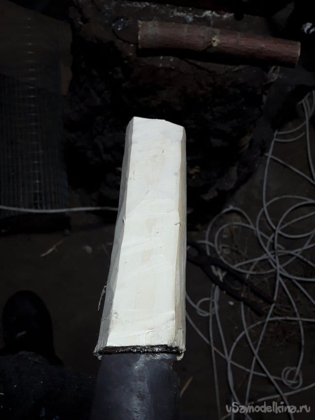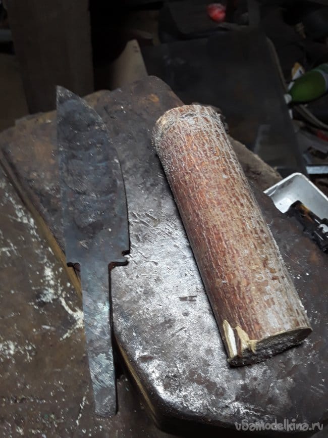 На фото лежит кусок стабилки из клена, мне клен нравится своим светлым красивым цветом особенно кап клена варенный в натуральном воске. Ножом снимаю остатки коры и примерно убираю все лишнее. Далее сверлю два отверстия под хвостовик. На хвостовике делаю насечки для более сильного приклеивания, и с мазав эпоксидным клеем вклеиваю хвостовик в рукоятку зажимаю в струбцину и оставляю на ночь сохнуть. Настало утро я вновь пришел в кузню. Попив чаю приступаю к формированию рукояти ножа. Особенность ножа не только в его продольном доле, но и еще в простоте изготовления. Особого здесь ничего нет просто шлифую рукоять чтобы удобно лежала в руке.