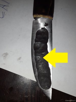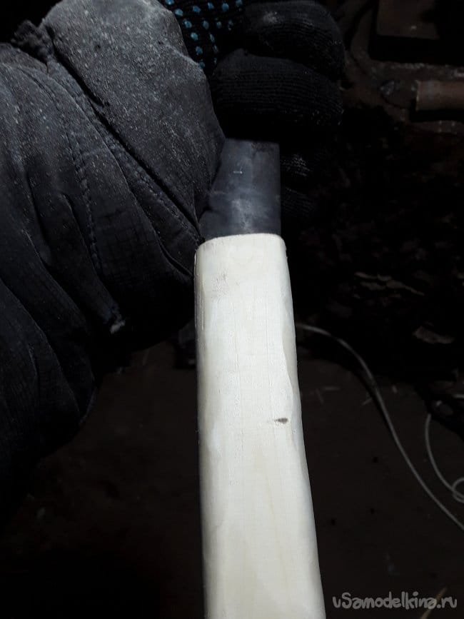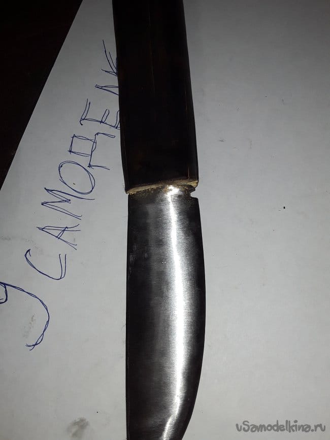 После шлифования рукоятки немного обжигаю древесину и пропитываю льняным маслом. Ну вот и все нож готов. Не судите строго особо над внешним видом не работал так как красота не важна главное чтобы нож был рабочем ножом некрасивым, но качественным. И самое главное не просто отшлифованным из плоской пластины, а кованный своими руками. В следующей статье возможно буду ковать нож из клапана хочу попробовать. Говорят нож из клапана тоже хорош. Почему я сковал нож для зимней рыбалки именно из подшипника и именно якутский потому, что у меня до этого был рыбацкий нож почти такой же и я им что только и не делал и деревья строгал и лунку долбил этот нож легок в обращении точится об любой камень. Этот нож прослужил мне 2 сезона зимней и летней рыбалки и как то на зимней рыбалке отколупал лед на лунке положил рядом, тянул щуку севшую на живца она резко дернула я отпустил леску, а она бородой унесла мой нож на дно щуку ту сволочу я то вытащил ну а нож к сожалению нет. Чтобы этот нож тоже не потерять я его и пропитывал маслом теперь этот нож не тонет я проверял.