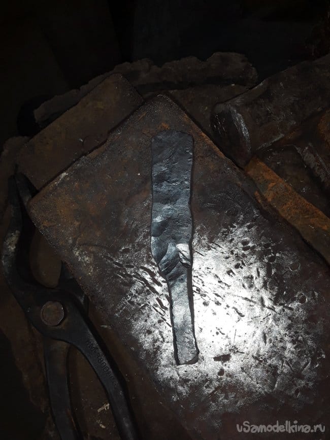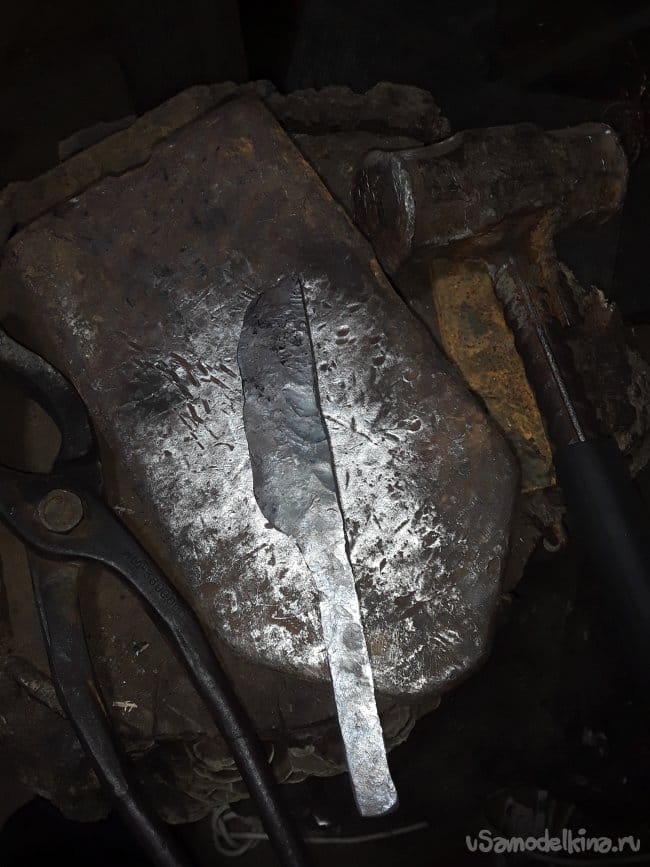 После отжига нагреваю заготовку до темно-желтого цвета и проковываю в полосу формируя примерную толщину. Металл в ковке очень мне понравился быстро нагревается, но и быстро остывает. Главное не сжечь металл иначе мы просто испортим заготовку. После проковки в пластину ушм отрезаю под углом с обратной стороны будущего лезвия так будет лучше в ковке острия главное не ковать сразу острие иначе оно сгорит при закалке. В стороне хвостовика тоже немного срезаю что мешает. Нож планирую с всадной ручкой и по этому проковываю хвостовик по толщины и ширине примерно не обязательно точно еще шлифоваться будет и не раз.