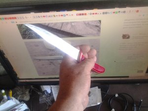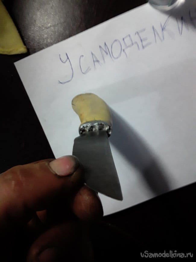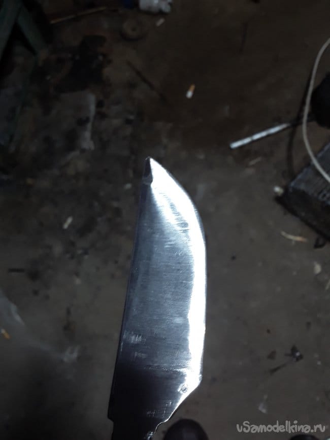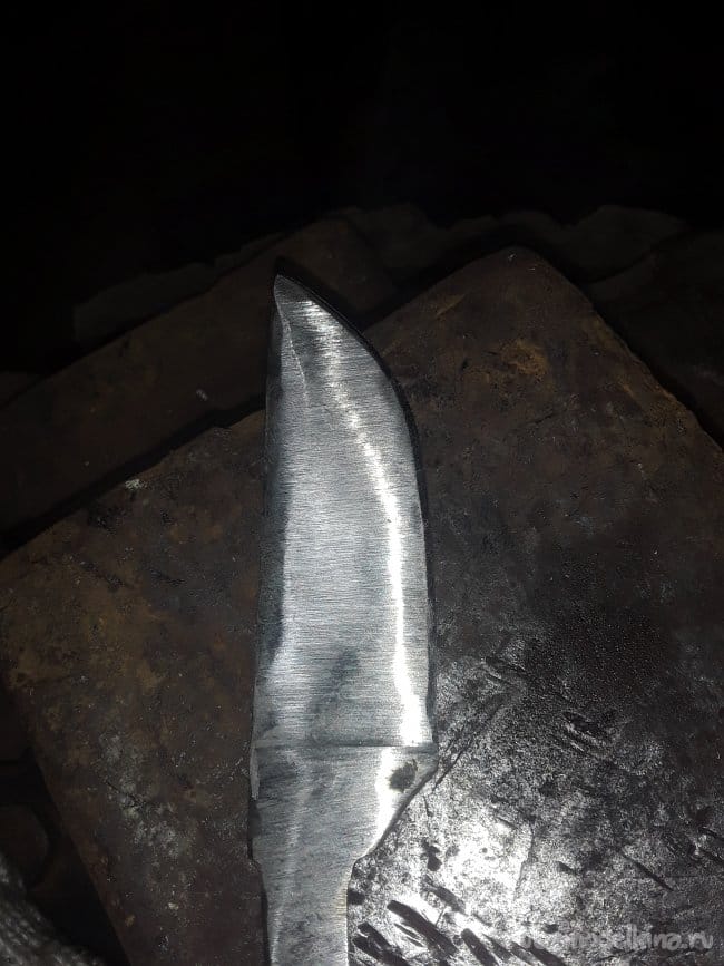 Ну вот ковка завершена, теперь нужно произвести закалку и отпуск клинка это самое важное в изготовление ножа, так как от этих двух процедур зависят качество клинка. О закалке в интернете говорят многое и я даже не знаю кого слушать как испортить сталь неправильной закалкой. В общем поискал и нашел более приемлемый. И так закалку произвожу на растительном масле нагрев стали клапана по советам нужно греть до 900 °C иначе сталь не закаляется при более низкой температуре. При такой температуре металл иметь светло желтый цвет нагреваю и окунаю в масло, но не весь клинок, а только острие типа зонная закалка. Окунаю на 6 секунд, а потом сразу зажигаю в тиски чтобы клинок не повело. После того как клинок остыл произвожу отпуск при температуре до 500 °C в течение 2 часов в печи сопротивления с градусником. Да забыл написать что после закалки шлифовал на Грин дере перед отпуском. Ну вот и все работы с клинком и огнем завершен вот фото клинка после закалки и отпуском. Шлифую в черновую клинок и приступаю к изготовлению рукояти.