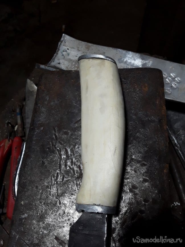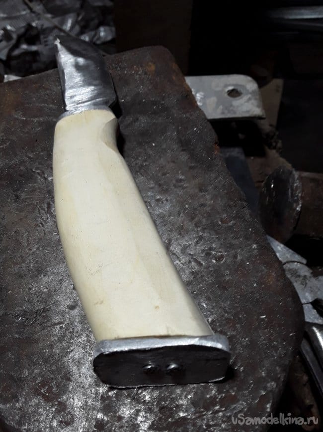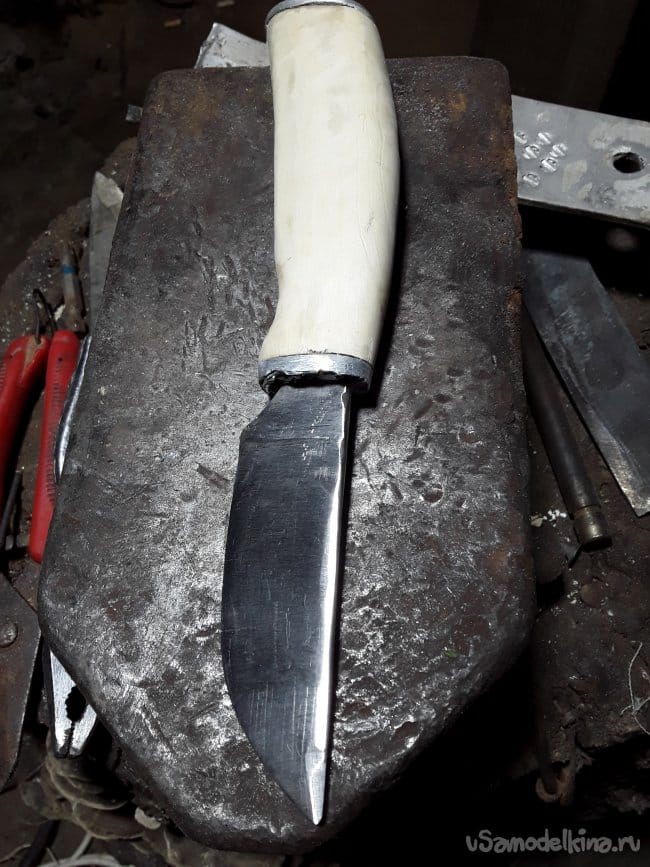 Рукоять ножа делаю из сушеного су веля клена варил его в соляном растворе 5 часов. Для больстера взял 5 мм полосу алюминиевую как то по случаю у электрика знакомого. Отрезал нужный мне кубик просверлил отверстие и для красоты решил набить битой звездочкой так за одно и щель между клинком и больстером убрал. Забиваю трубкой на хвостовик и приступаю к дереву ковель сухая готовая к обработке сделав разметку на дереве просверлил два отверстия нужной глубинны и протрусил все полкой заливаю все эпоксидным клеем зажимаю в струбцину и оставляю на ночь сохнуть. После высыхания предаю на ленте нужную форму рукояти. После шлифовки не знаю как называется, но вроде тыльник вырезаю из той же пластины просверливаю два отверстия и смазав все клеем забиваю двумя гвоздиками и на ленте шлифую все окончательно. Вот и все ручка готова осталось просто пропитать все льняным маслом в вакуумной камере в течение 2‐х часов. Яну вот и все после пропитки древесина стала прочнее и устойчивей к воде да и красиво, а самое главное удобно лежит в руке.