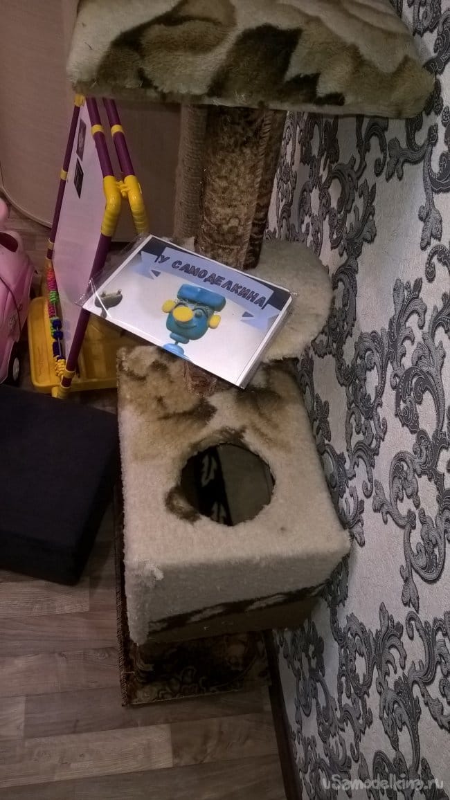Тканью обшил домик снаружи и внутри, в лежак верхний вырезал мебельный поролон и обтянул. Ткань крепил с помощью строительного степлера также использовал термоклей. На длинный столбик купил канат джутовый 8мм. Туго намотал джутовый канат и максимально сжато, ушло 50 метров. Короткие столбики обтянул обрезками ковровым покрытием и на нижнее основание. Каждый столбик когтеточки прикрутил на мебельные шурупы.