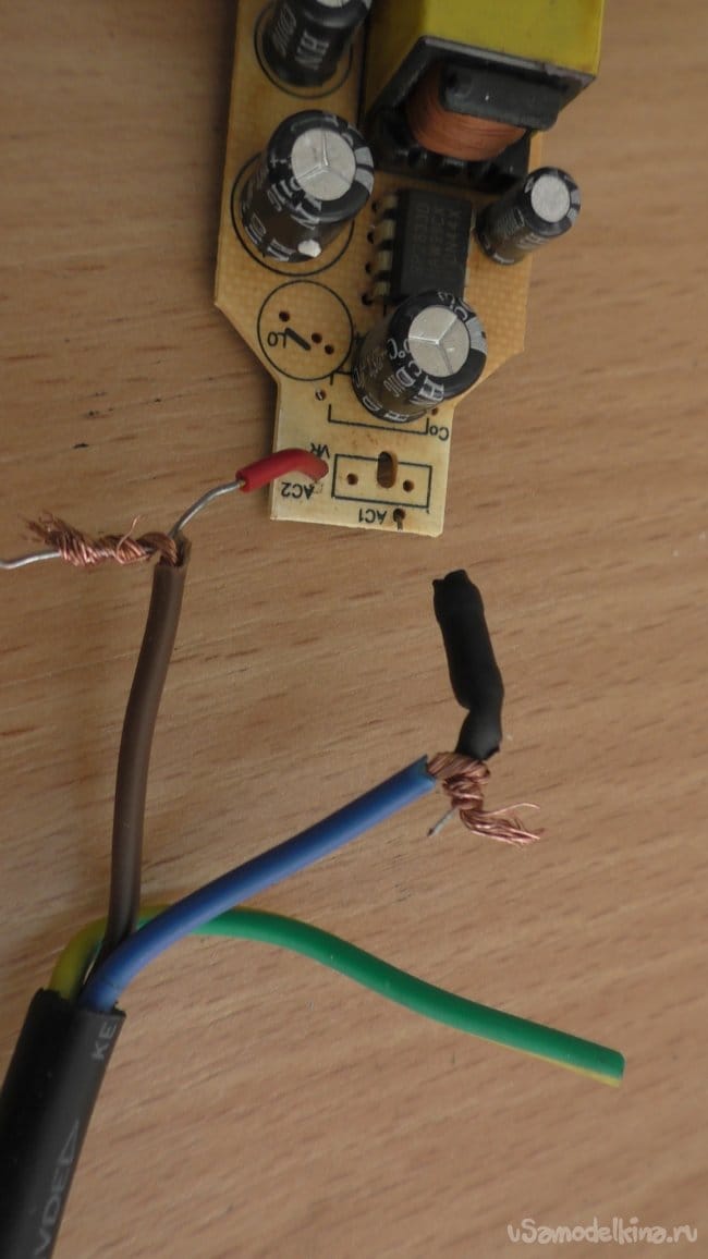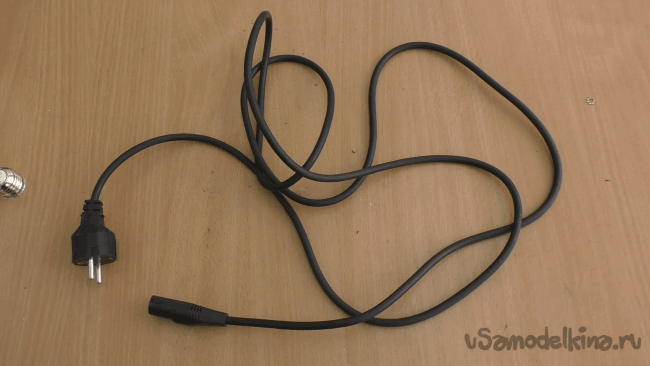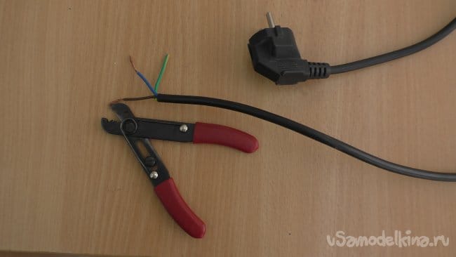Найдя в закромах старый компьютерный кабель, я отрезал и распотрошил ненужную компьютерную сторону, оставив вилку.