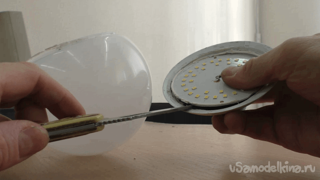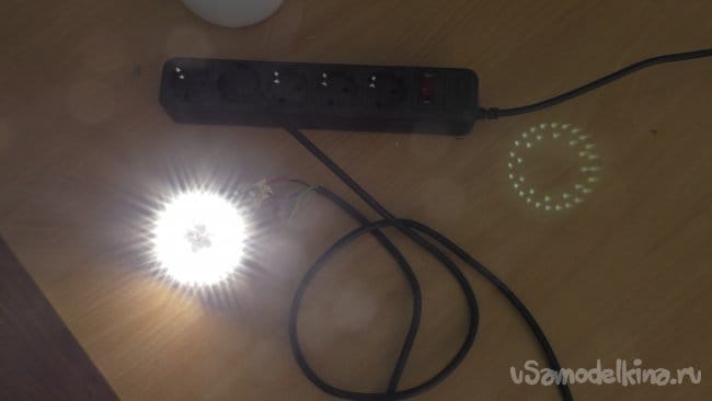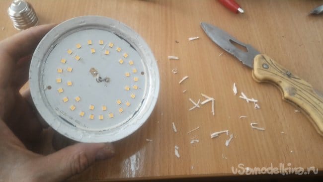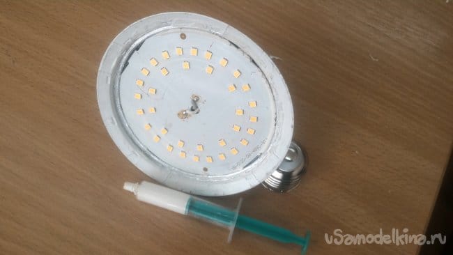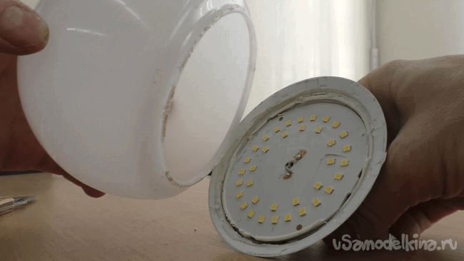 мгновенно бросил, едва не получив ожог. Она была раскалена. Значит, ей обязательно нужен радиатор, благо корпуса таких ламп ими и являются. Нужно только обеспечить контакт светодиодной панели и алюминия в корпусе с помощью термоклея.