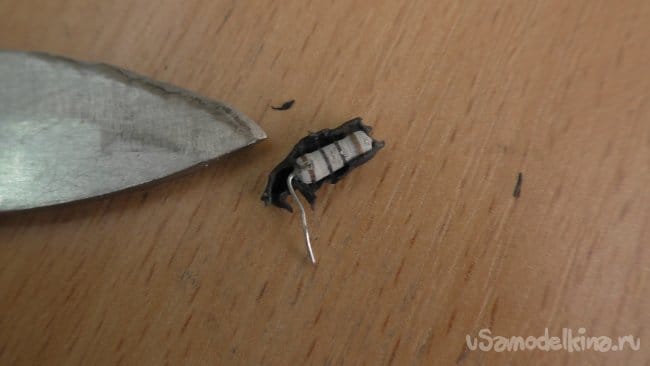 После зачистки проводов, я дрожащими от нетерпения руками стал приматывать их к контактам драйвера лампы. Нетерпение моё, разумеется, вышло мне боком, что проявилось в отваливании одного из контактов. Причем того, который представлял из себя не просто провод, а резистор. И оторвался (ну надо же) провод именно от тела самого резистора, приведя его, очевидно, в негодность.
