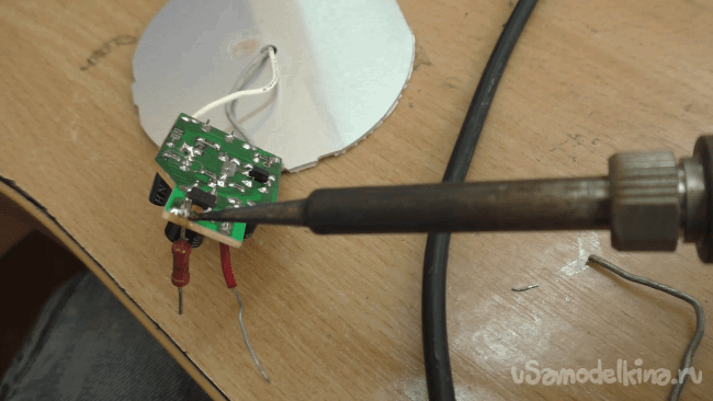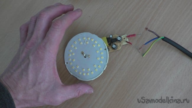 Осталось дело за малым – найти будущей лампе основание, все спаять, всё заснять, и на «самоделкина» выставить. Я тут же схватил светодиодную панель за самую металлическую часть и…