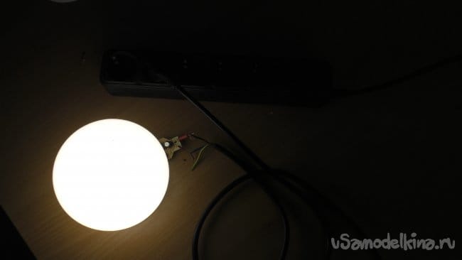И решил я исполнить с её помощью собственное желание – сделать ночник. И уже придумал откуда выдрать трехцветный светодиод, чтобы с его помощью заставить сей шарик переливаться всеми цветами, как вдруг засомневался. А что, если лампа-то рабочая? Уже не раз так бывало, что поднятое на улице, оказывалось вполне себе живой вещью, нуждающейся в совершенно примитивном ремонте, вроде восстановления оторванного провода.