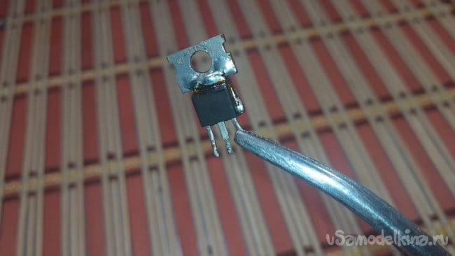Я просто взял и припаял полевой транзистор к подложке неработающего транзистора в корпусе ТО - 220, а потом прикрутил небольшой радиатор, конечно немного не той стороной но итак нормально. Транзистор работает в импульсном режиме так что сильно греться он не должен.