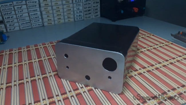 Дальше я решил изготовить корпус. На чердаке нашёл пластиковую коробочку к ней надо было ещё сделать переднюю панель. Сделал я её из алюминия. Но к сожалению коробочка у меня оказалась довольно-таки проблематичной и дело в том что устанавливать платы было довольно-таки сложно поэтому я не снимал процесс сборки на камеру так, как были проблемы но всё же я смог и получилась довольно-таки красиво.