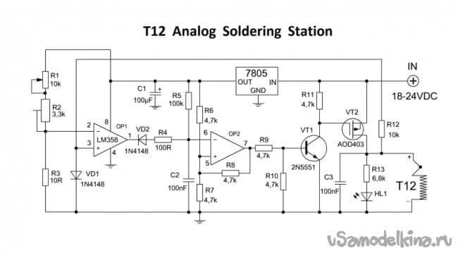 Регулировка температуры производится за счёт опорного напряжения. Чтобы его изменить надо покрутить переменным резистором. Опорное напряжения формирует стабилизатор напряжения на 5 В от него также запитан и сам операционник. После сборки платы всё должно запуститься с первого раза.
