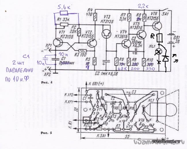 VT4, VT5 генератор с усилителем сигнала, который обеспечивает три визуального состояния лампы накаливания HL1: