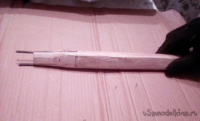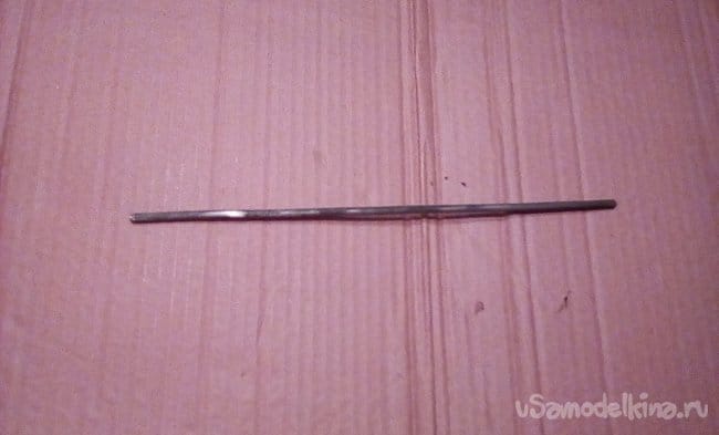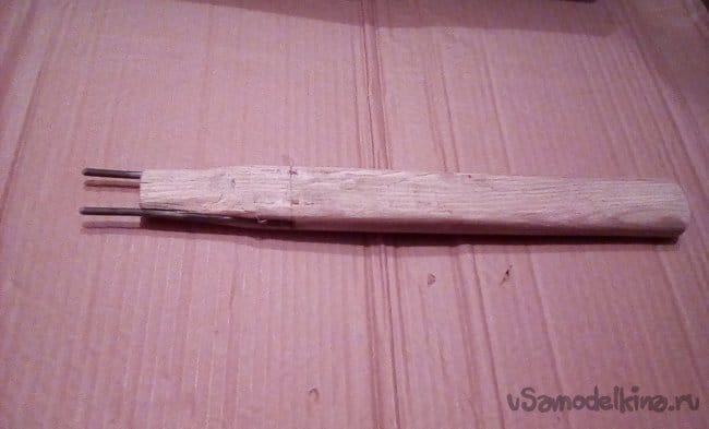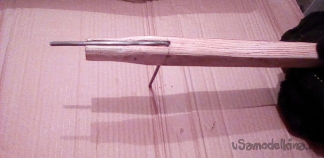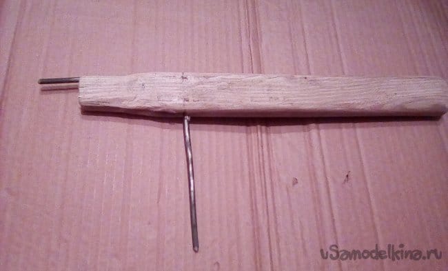 Шаг-3. Зажав ручку в тиски стамеской делаем паз, шириной и глубиной 4 мм. Причем снизу ручки делаем такой же паз. Сгибаем в тисках проволоку в середине под углом 90 градусов, и одним концом вставляем в наше отверстие, показано на фото.