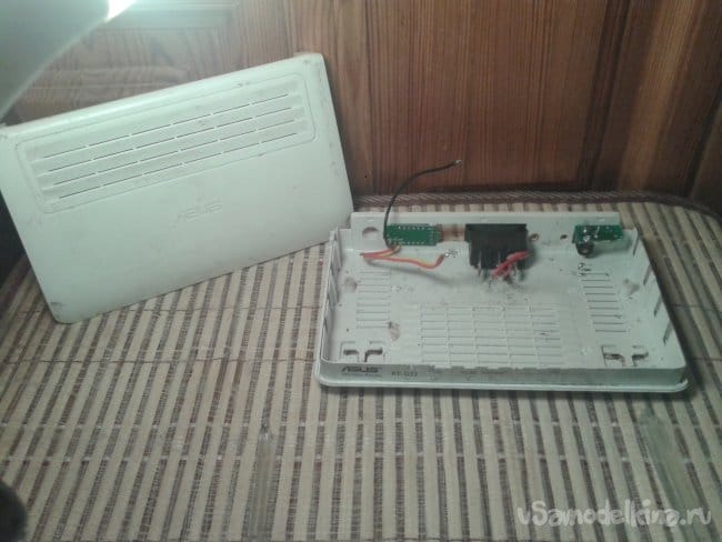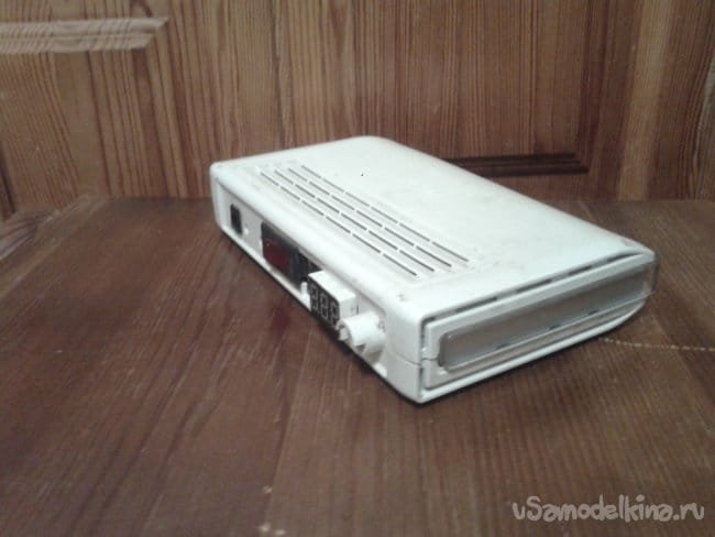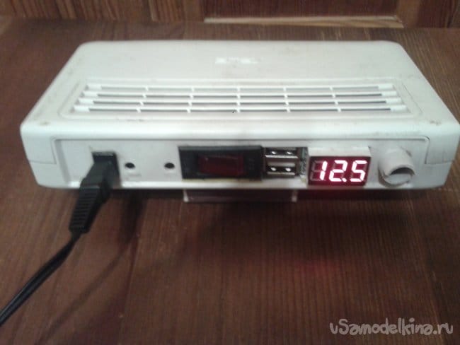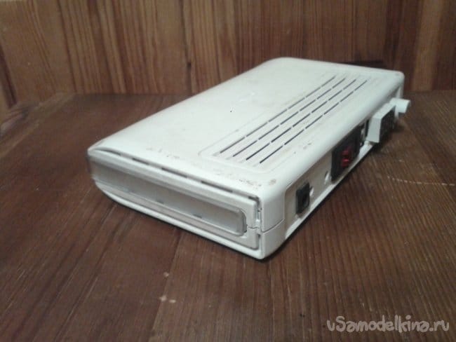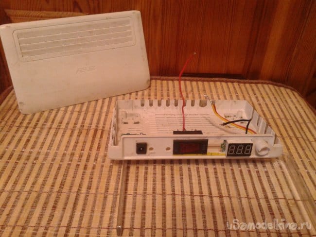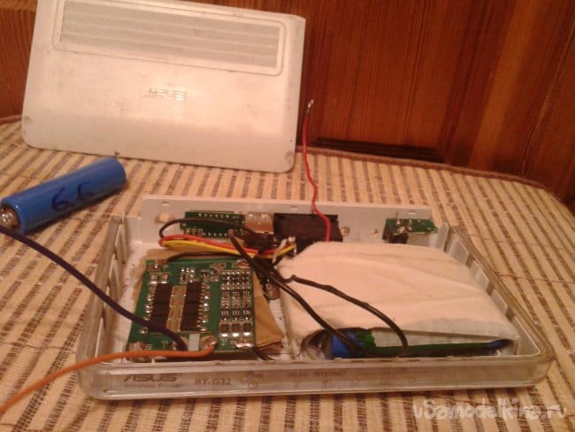 Покопавшись в кладовки, я нашел сгоревший роутер с целым корпусом, китайский вольтметр, автомобильный выключатель, двойной USB разъем с понижением до 5В и три литий-ионных аккумулятора.