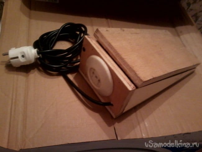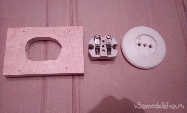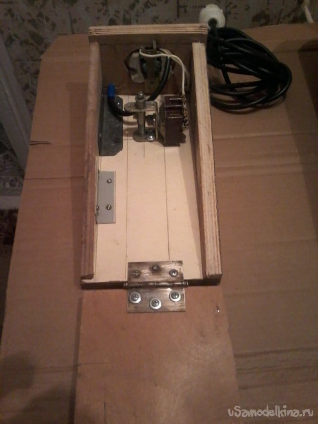 Материалы: фанера 10 -15мм толщины, кнопка без фиксации с контактами , выдерживающие ток до 6 – 10А, любая евророзетка, сетевой шнур питания 1 -2м сечением провода 1,5 – 2,5 мм2, евровилка, саморезы, небольшая петля, можно от рамы.