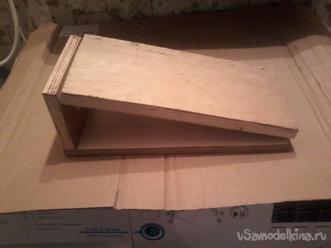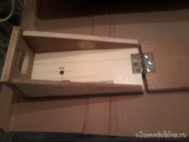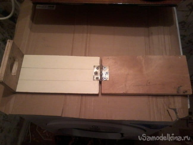 Соединяем все три части при помощи саморезов и петли, показано на фото. При этом верхняя часть не должна ложиться на переднюю
