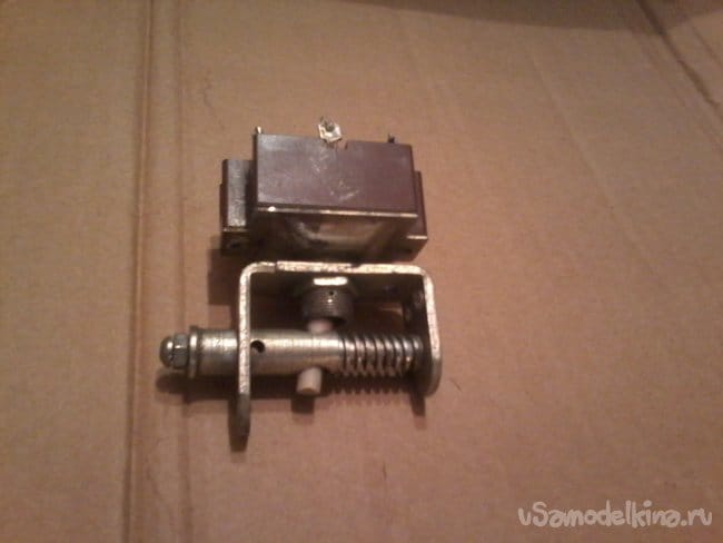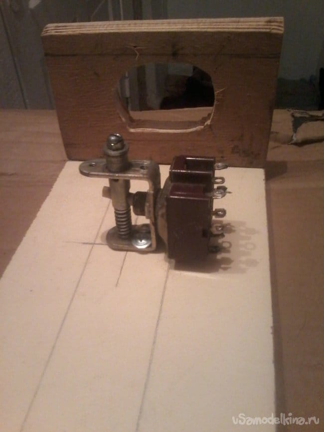 Все три контакта я запаял параллельно, увеличив при этом ток через контакты до 9А. Можно подключать нагрузку до двух с лишним киловатт. Сверху тумблера закреплена П –образная скоба. В ней расположен шток с пружиной, благодаря ей шток возвращает тумблер в исходное состояние, после отпускания педали.
