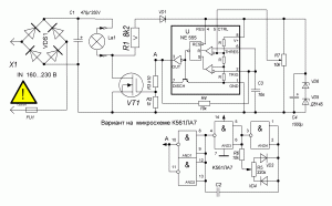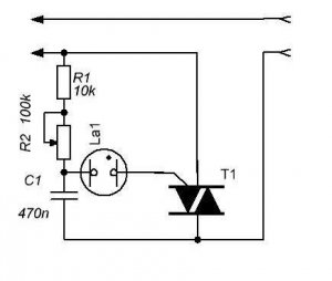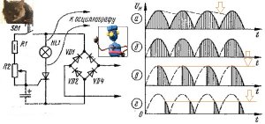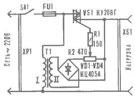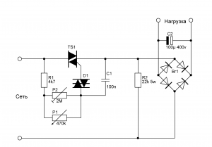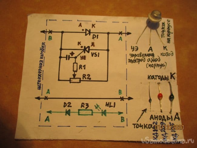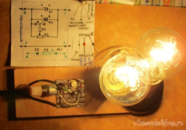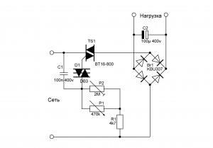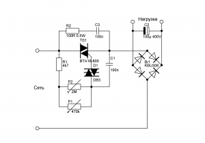 О деталях. Перепробовал тиристоры: КУ101А, Б, Е, КУ103Б – все ведут себя одинаково. Диод Д1 КД105 или КД209 с любой буквой. Переменный резистор R2, в первом экземпляре – 150 КОм, на макете – 47 КОм (какие нашёл в загашнике), но лучше 100 – 120 КОм, с таким наибольшая плавность регулировки напряжения. Причём, похожие внешне, марки у них разные: СП3-9а, СП-04, СПО-05, и др, расстояние между выводами у всех разное, что отразится на рисунке печатной платы. Меньше 33 КОм не ставьте, будет греться, а больше 150 КОм – будет мёртвая (нерегулируемая) зона при повороте движка R2. Такие же большие разбросы в схемах у конденсатора С1: 4,7 -47 МкФ, (лучше 10 -20 МкФ) и резистора R1: 2 -30 КОм (2,7 КОм), произведение которых Т (тау, время,) отвечают за угол открытия тиристора: Т=RC. Для наглядности можно добавить, что я и сделал, цепочку Д2 (КД102, 105, 209), резистор R3, светодиод HL1. Светодиод плавно загорается или гаснет, в зависимости от поворота ручки резистора R3, а вся цепочка подключается со стороны паяльника к точкам А, В, и, по существу, указывает на угол включения тиристора. Светодиод импортный, диаметром 3 мм, а вот с резистором R3 произошла интересная история. На 220 Вольт, R3 примерно 100 Ком, ток – 2,5 мА, попробовал – слишком ярко, дошёл до… 6,6 МОм (2шт. последовательно по 3.3 МОм) – горит! Видимо, HL1 загорается от выбросов при включении VS1, или из-за крутых фронтов, т.к. при токе 0,00004 А, (40 микроампер), светодиод гореть не может!
