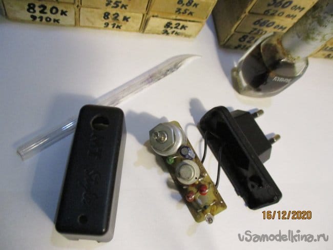 Правильно спаянная схема в наладке не нуждается, кроме подбора R3 (от 100 КОм и выше), по желаемой яркости свечения светодиода. Так как места в коробке хватает, использовал резисторы МЛТ-0,5, R3 состоит из двух последовательно включённых резисторов.