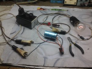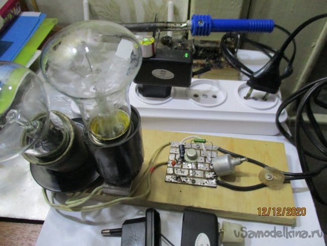 Штеккерная коробка была взята от неисправного зарядного устройства китайского производства на корпусе которой выдавлен штамп «TOPSTAR». Через год, мне попала в руки точно такая же китайская коробка, но уже со штампом «AMT Style». Решил в ней изготовить такой же регулятор, но уже для паяльника мощностью 90Вт. Но вот вопрос, выдержат и не будут ли греться диод и тиристор? Чтобы проверить, спаял схему на макетной плате и нагрузил двумя лампами включенных параллельно, на 220 В и 60 Вт каждая. Подключил одну лампу – ничего не греется, две лампы – еле ощутимый нагрев тиристора при мощности 120 Вт и примерным током 0,5 А (по 0,25А на диод и тиристор). Какой раз убеждаюсь в отличных характеристиках советских тиристоров и диодов, имеющих очень малое внутреннее сопротивление в открытом состоянии и с большим запасом по напряжению и мощности!