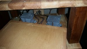 Все корпуса из делева. Все питается отдельно. Провода спрятаны в короб сзади полки. Если кому нибудь захочется - попробую что-нибудь разобрать и рассказать. Делал давно. На сайте бываю набегом. Не обессудьте.