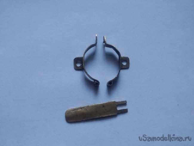 Далее изготовить хомут, при помощи которого пузырёк закрепляется в кожухе, и деталь, которая соединяет кожух и хомут между собой. Для этого применяются ножницы по металлу и пассатижи. В деталях хомута высверливаются отверстия диаметром 3 мм для прижимных винтов.