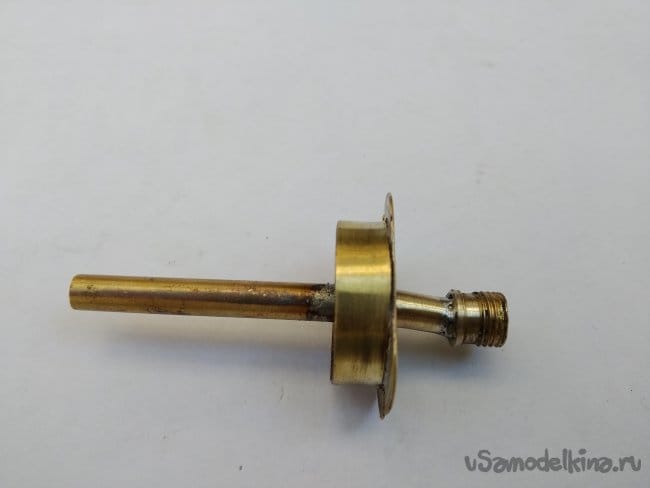 Теперь к верху трубки нужно припаять горлышко с резьбой, изготовленное из соска автомобильной или велосипедной камеры.