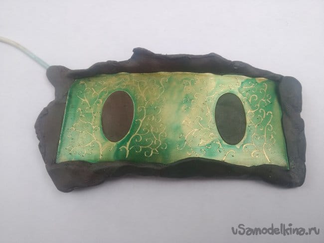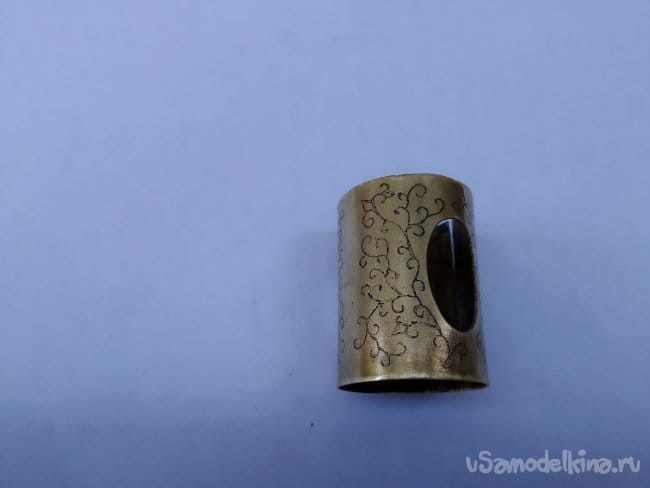 Затем поверхность кожуха покрывается защитным изолирующим слоем в моём случае это цапонлак (но это не лучший вариант). После чего при помощи иглы процарапывается узор. Заднюю стенку я дополнительно оклеил пластилином, он так же закрывает торцы заготовки, на которых возможно нежелательное протравливание.