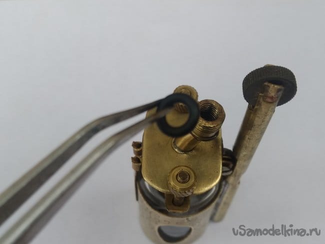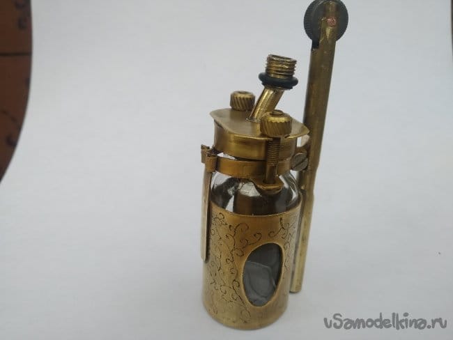 Фитиль вставляется в трубку, и все элементы собираются вместе. Пузырёк вставляется в кожух, закрепляется хомутом, а сверху одевается крышка с трубкой закрепляемая прижимными винтами. Уплотнителем между крышкой и горлышком служит резиновая пробка от этого пузырька с проделанным в её центре отверстием под трубку.
