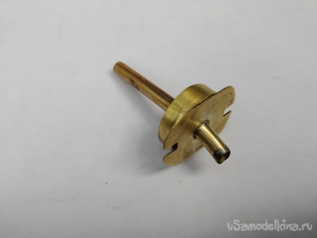 Далее необходимо изготовить крышку для пузырька с трубкой, в которую будет помещён фитиль. Для чего следует из листовой латуни вырезать пластину подходящего размера, просверлить в её центре отверстие соответствующее внешнему диаметру трубки (в моём случае 4,5мм), в краях пластинки при помощи надфиля сделать прорези для прижимных винтов. С нижней стороны к пластинке припаивается кольцо из листовой латуни изготовленное методом аналогичным применявшемуся при сгибании кожуха, но в этом случае диаметр прутка должен соответствовать диаметру горлышка пузырька. Трубку через которую будет проходить фитиль следует немного изогнуть для того что бы в завершённом изделии он располагался ближе к кремню.