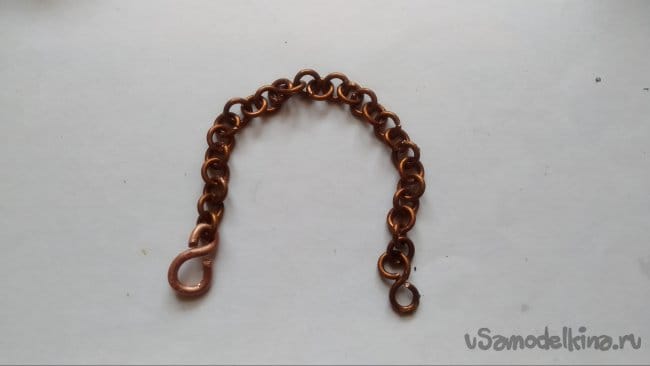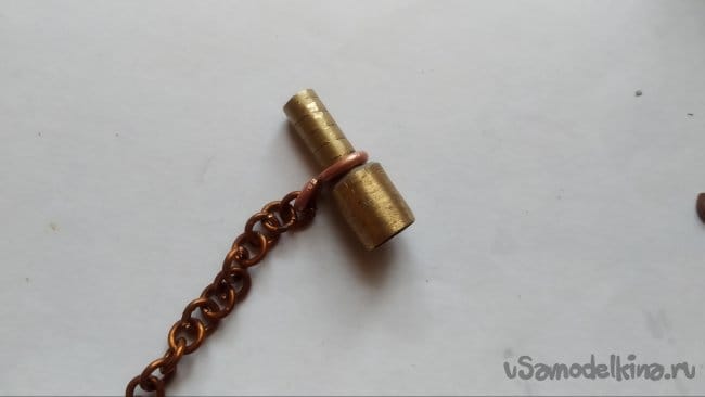 Теперь изготавливается крышка из колпачка для автомобильной покрышки и обрезка соска, который остался после изготовления горлышка с резьбой. К крышке прикрепляется цепочка из медной проволоки. Затем крышка прикрепляется к зажигалке.