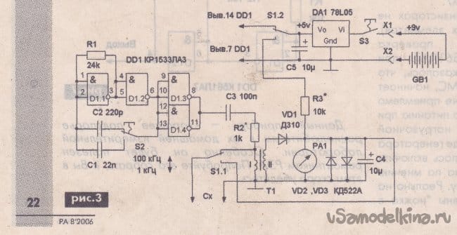 Генератор на 555 таймере вырабатывает прямоугольные импульсы частотой 100 кГц, через Резистор R2 и конденсатор С3 они поступают на первичную обмотку трансформатора Т1. Ко вторичной обмотке которого через выпрямительный германиевый диод подключен стрелочный микроамперметр, который отградуирован на показания в Омах.