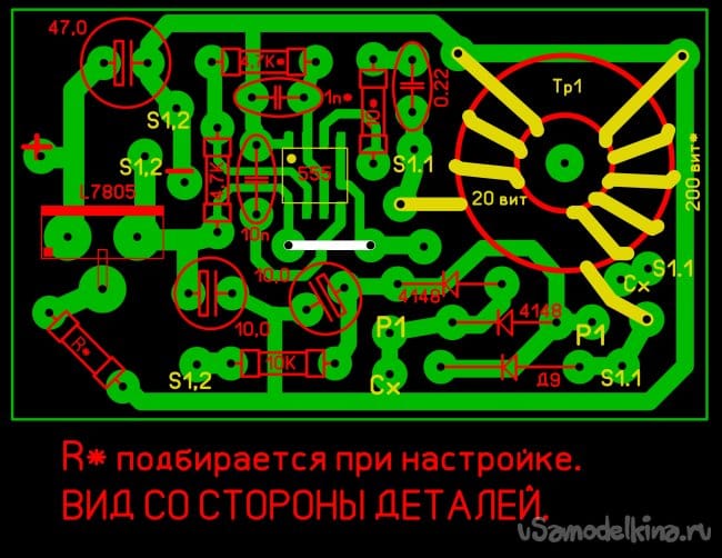 Схему перерисовывать не стал, сразу рисовал плату под 555 таймер. Думаю что трудностей с повторением не должно возникнуть, на плате указаны все номиналы.